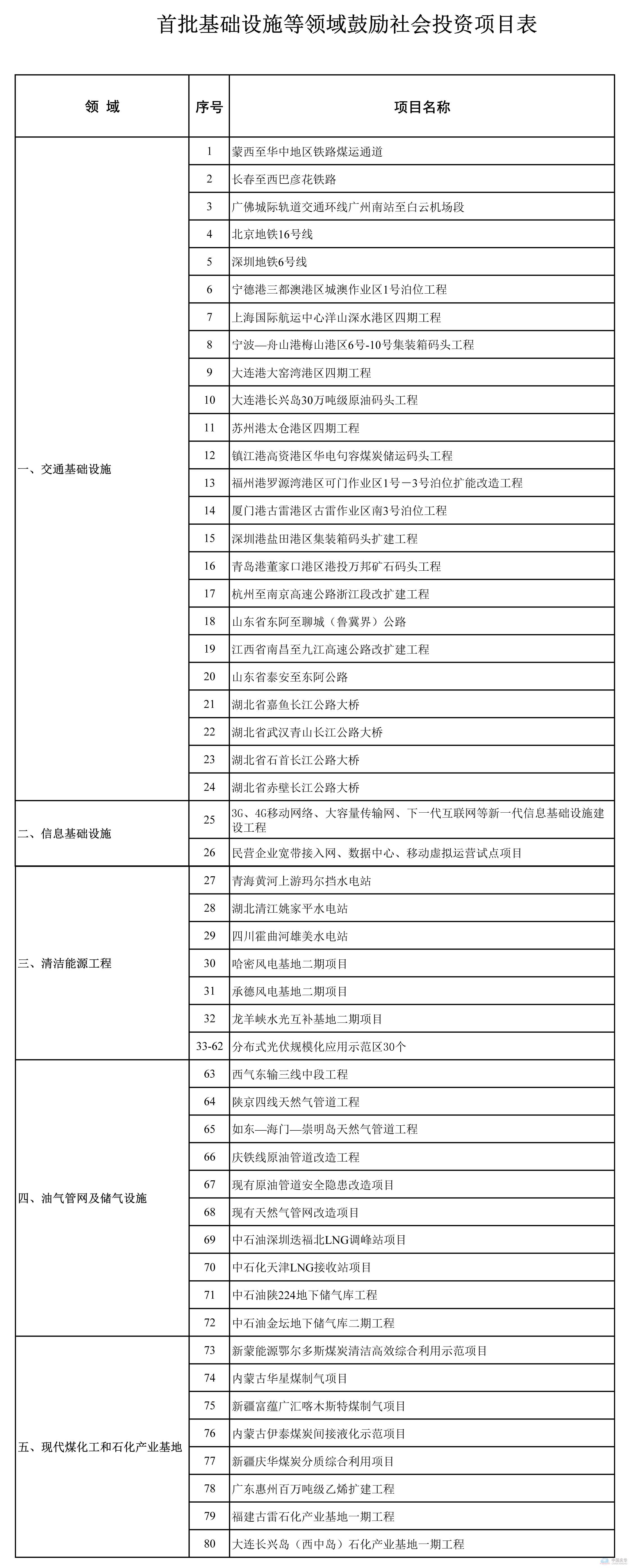 一、首批推出的基礎(chǔ)設(shè)施等領(lǐng)域鼓勵社會資本參與的80個項目涵蓋鐵路、公路、港口等交通基礎(chǔ)設(shè)施,新一代信息基礎(chǔ)設(shè)施,重大水電、風(fēng)電、光伏發(fā)電等清潔能源工程,油氣管網(wǎng)及儲氣設(shè)施,現(xiàn)代煤化工和石化產(chǎn)業(yè)基地等方面,鼓勵和吸引社會資本特別是民間投資以合資、獨(dú)資、特許經(jīng)營等方式參與建設(shè)及營運(yùn)。