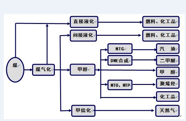 現代新型煤制油化工技術是以煤炭為基本原料,經過氣化、合成、液化、熱解等煤炭利用的技術途徑,生產潔凈能源和大宗化工產品,如合成氣、天然氣、柴油、汽油、航空煤油、液化石油氣、聚乙烯、聚丙烯、甲醇、二甲醚等。改變傳統的煤炭燃燒、電石、煉焦等以高污染、低效率為特點的傳統利用方式。