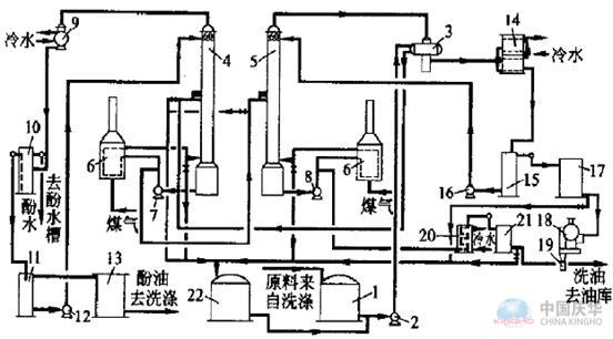 注:(1—原料槽;2—原料泵;3—原料與工業萘換熱器;4—初餾塔;5—精餾塔;6—管式爐;7—初餾塔熱油循環泵;8—精餾塔熱油循環泵;9酚油冷凝冷卻器;10—油水分離器;11—酚油回流槽;12—酚油回流泵;13—酚油槽;14—工業萘汽化冷凝冷卻器;15—工業萘回流槽;16—工業萘回流泵;17—工業萘貯槽;18—轉鼓結晶機;19—工業萘裝袋自動稱量裝置;20—洗油冷卻器;21—洗油計量槽;22—中間槽)